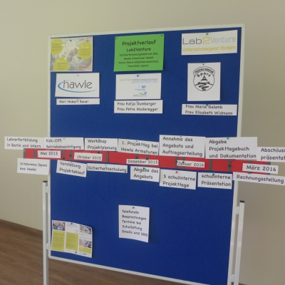 Nach dem Auftakt-Workshop Lab2Venture (L2V) am 5./6. Dezember 2014 in Berlin, war das Frühjahr 2015 geprägt durch intensive Suche nach Schulpartnern und Firmen für das Lab2Venture Projekt mit der Offenen Jugendwerkstatt Karlsruhe (OJW). Fast 20 Schulen und 15 Firmen wurden angeschrieben bzw. angesprochen, ihnen das notwendige Informationsmaterial übermittelt und Gespräche angeboten. Dies bedurfte eines nicht zu unterschätzenden Zeitaufwandes und war selbstverständlich mit vielen Frustrationen verbunden. Letztendlich blieb aus verschiedenen Gründen das Markgrafen-Gymnasium in Karlsruhe-Durlach übrig. Sechs Auftraggeber konnten gewonnen werden (s.u.), so dass einem L2V-Start im Schuljahr 2015/16 nichts mehr im Wege stand.